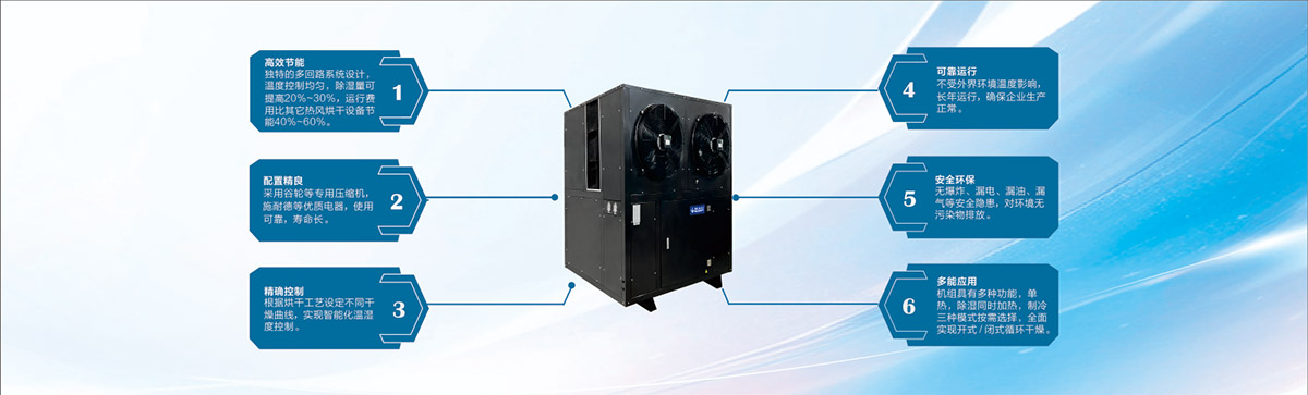 多功能热泵烘干机,产品采用谷轮压缩机,确保机器稳系统控制实现加热、除湿、自动恒温、自动烘干等5大模式。